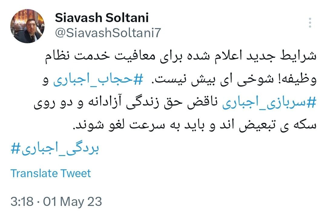 سیاوش سلطانی عضو شورای مرکزی جبهه ملی ایران در توئیتی به شرایط تازه منتشر شده از سوی ستاد نیروهای مسلح برای خدمت نظام وظیفه واکنش نشان داد. این اولین واکنش از طرف یکی از اشخاص مطرح اپوزیسیون نسبت به این شرایط تازه منتشر شده است.